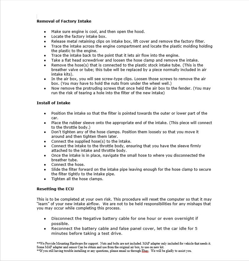 Votre kit comprend la tuyauterie d'admission à haute vitesse, un filtre à air haute performance réutilisable et tous les raccords, colliers et accessoires nécessaires pour une installation complète et sécurisée.
